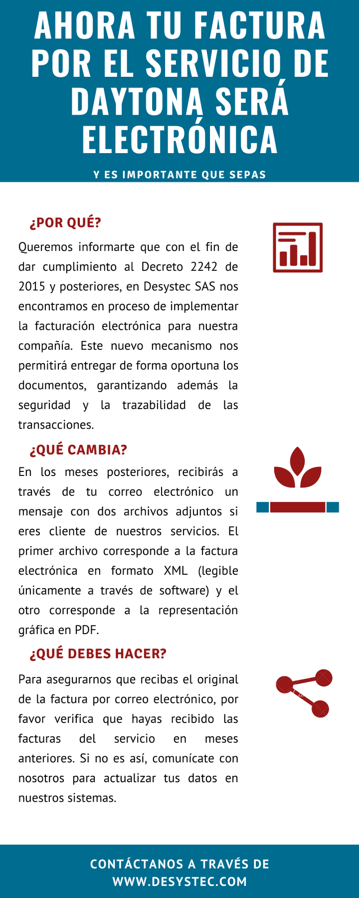 Iniciamos la transición para facturar nuestros servicios Daytona de forma electrónica. Esto significa que sustituiremos las facturas que en este momento emitimos por computador y recibirás un documento que cumple con todas las disposiciones legales y el estándar de factura electrónica. Este cambio no afecta para nada el uso que haces de nuestros servicios en la nube. Es un cambio en nuestros procesos internos para dar cumplimiento a lo dispuesto en la normatividad colombiana.